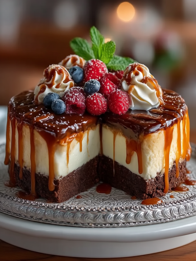 Jeśli serwujesz brownie cheesecake na specjalną okazję, podaj go z kulką lodów waniliowych i gałązką świeżej mięty. Możesz też stworzyć dekoracyjny sos na talerzu, używając malinowego purée lub karmelu. Biała czekolada roztopiona i spiralnie rozlana na talerzu również prezentuje się wspaniale.