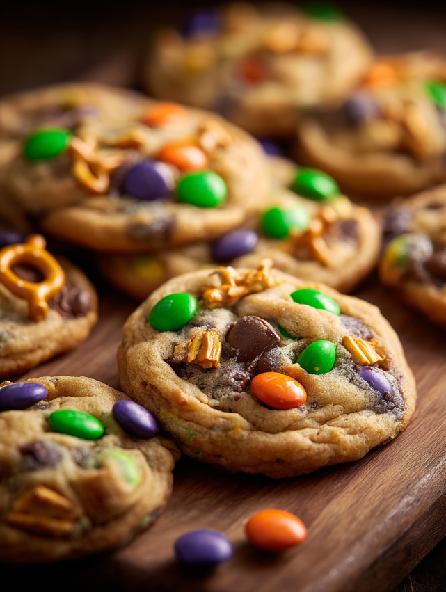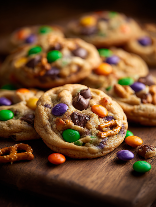 Delikatnie wmieszaj czekoladki i halloweenowe M&Ms używając dużej łyżki lub szpatułki. Jeśli używasz opcjonalnych dodatków jak precle czy barwnik spożywczy, dodaj je na tym etapie. Ciasto powinno być gęste i usiane kolorowymi cukierkami.