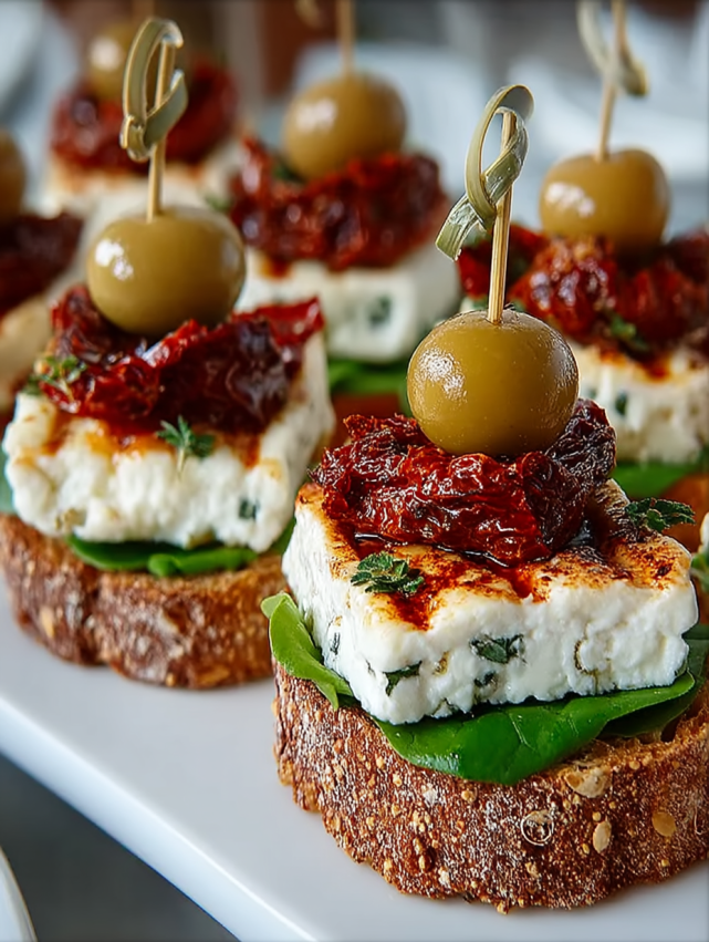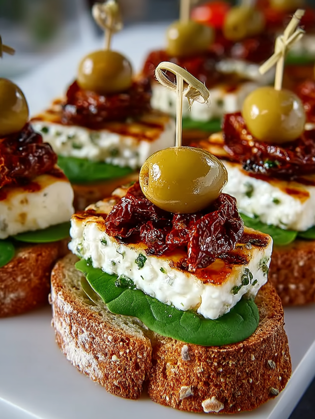 Na każdy plaster bagietki połóż liść szpinaku, delikatnie go rozprostowując. Następnie dodaj kawałek suszonego pomidora i podsmażony ser camembert. Na koniec wbij ozdobną wykałaczkę i nanizz na nią oliwkę.