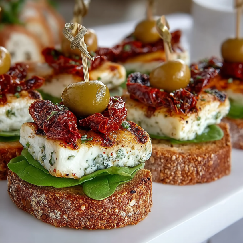 Na każdy plaster bagietki połóż liść szpinaku, delikatnie go rozprostowując. Następnie dodaj kawałek suszonego pomidora i podsmażony ser camembert. Na koniec wbij ozdobną wykałaczkę i nanizz na nią oliwkę.
