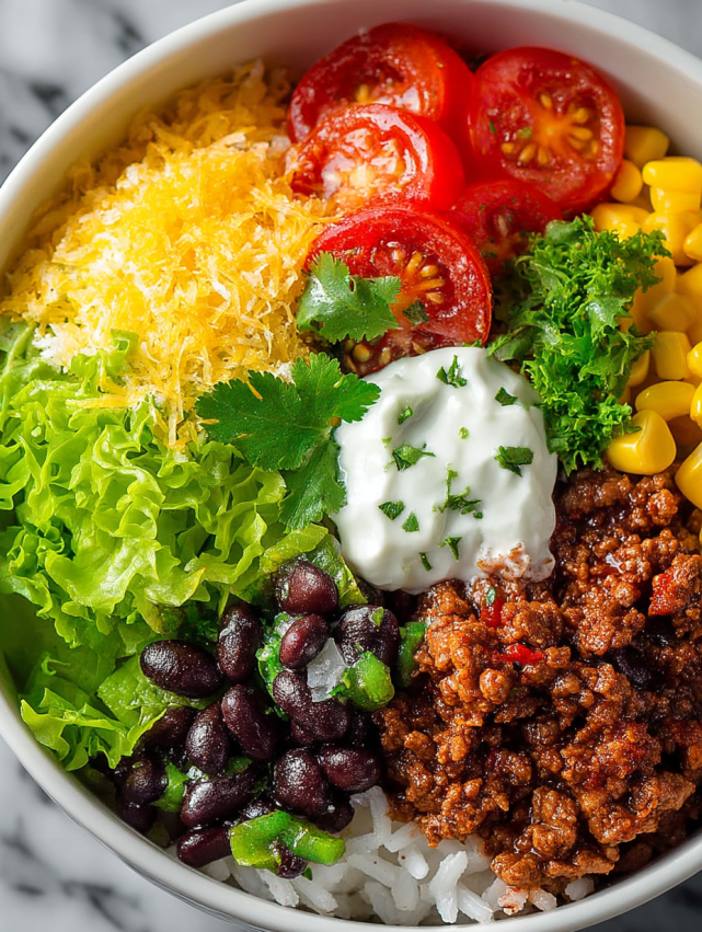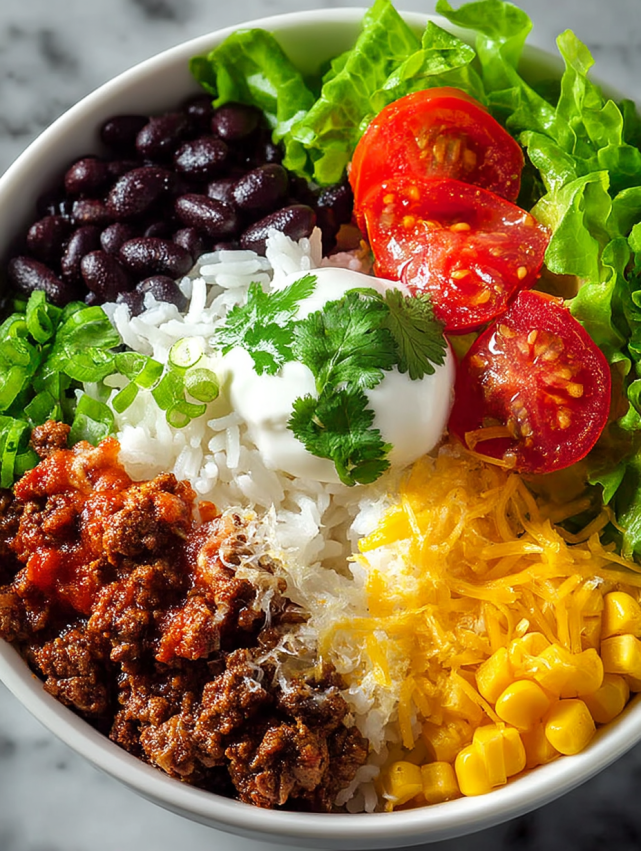 Aby stworzyć idealną miskę burrito, zacznij od hojnej porcji puszystego białego ryżu na dnie każdej miski. Następnie ułóż doprawioną wołowinę w jednej części miski, tworząc estetyczny podział składników.