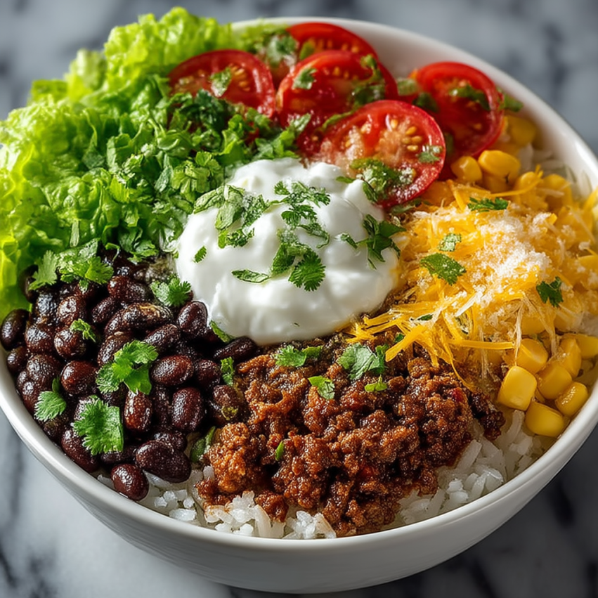 Aby stworzyć idealną miskę burrito, zacznij od hojnej porcji puszystego białego ryżu na dnie każdej miski. Następnie ułóż doprawioną wołowinę w jednej części miski, tworząc estetyczny podział składników.