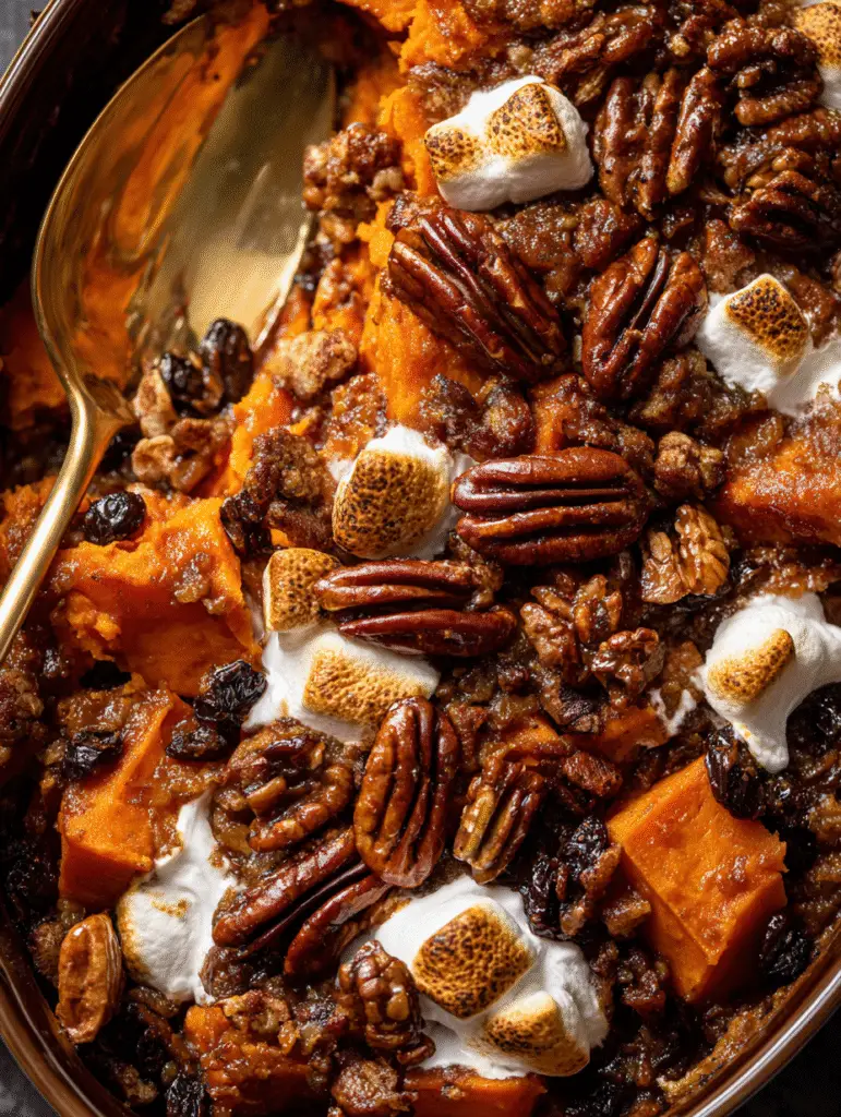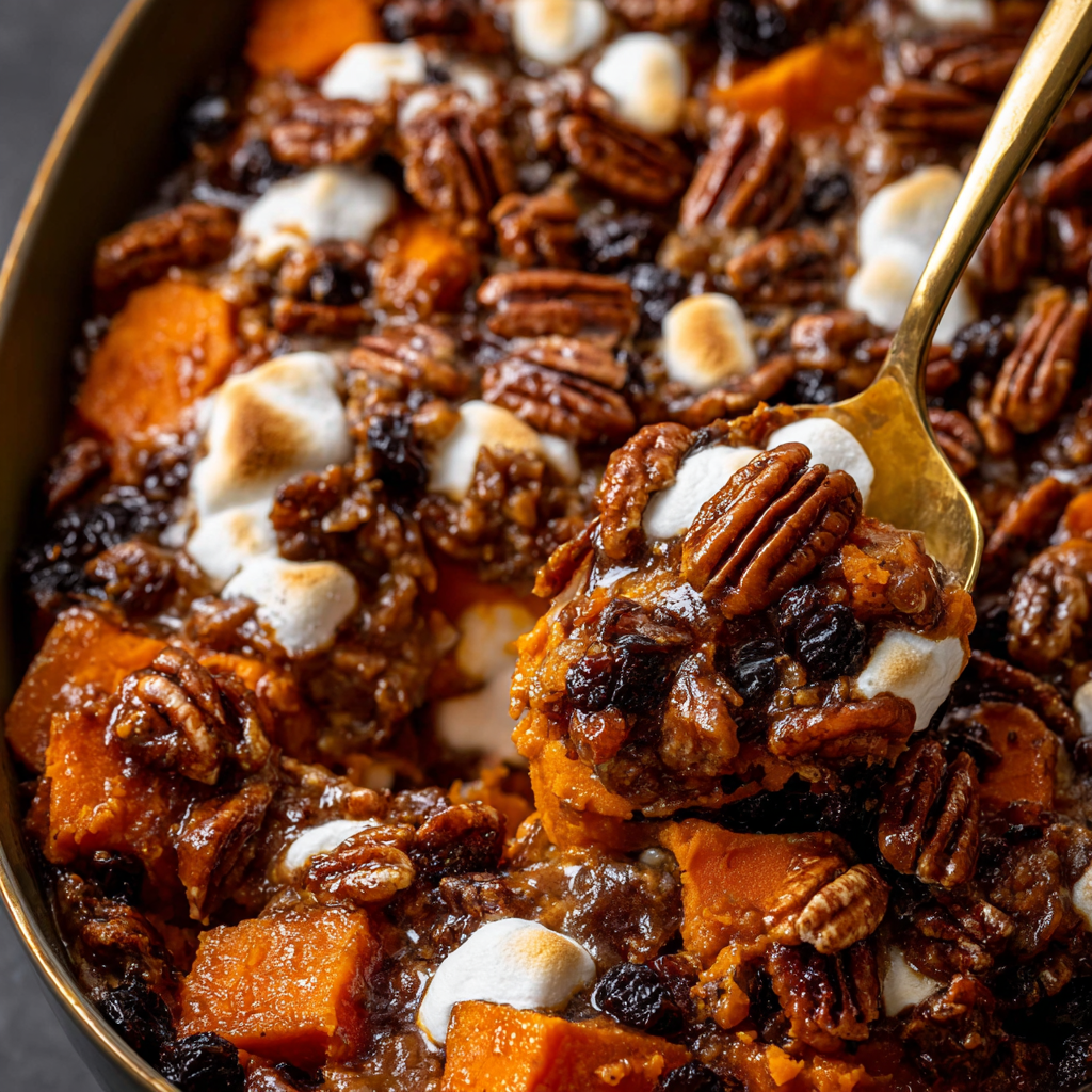 Few dishes evoke the heart of a Southern kitchen like a maple-sweet potato casserole. This dish is velvety, richly sweet, and warmly spiced — a true soul-warming favorite at Thanksgiving or any special gathering. Roasted sweet potatoes are blended with maple syrup, brown sugar, raisins, marshmallows, and finished with a crunchy pecan-maple topping that adds an irresistible texture contrast.