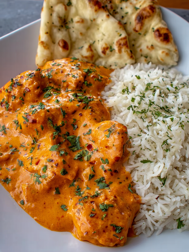 Podawaj butter chicken na gorąco z ciepłym chlebem naan i gotowanym ryżem. Połączenie kremowego sosu, soczystego kurczaka i chrupiącego chleba to prawdziwa uczta dla podniebienia. Ciesz się tym wspaniałym, pełnym smaku daniem, które przeniesie Cię prosto do serca indyjskiej kuchni!